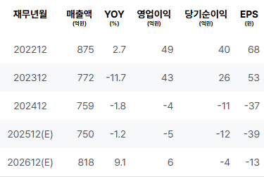2025년 데이터에 따르면, 매출이 어느 정도 유지되고 있으나 영업이익과 순이익 모두 적자 상태입니다. 이는 기업이 수익성 회복에 어려움을 겪고 있음을 나타내며, 주가 측면에서 부정적인 여지가 존재합니다. |