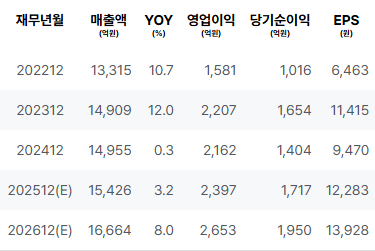 2025년 이전의 펀더멘탈 데이터에 따르면, 매출은 안정적인 증가세를 보였습니다. 2023년도에는 매출이 증가하였고 영업이익과 순이익 역시 긍정적인 변화가 있었습니다. 그러나 2024년도에는 영업이익과 순이익이 소폭 감소하였으며, 이는 일시적인 조정일 가능성이 높습니다. 이러한 경향은 향후 몇 년간 계속될 것으로 보이며, 전반적인 재무 지표가 안정적인 개선을 보여주고 있습니다. |