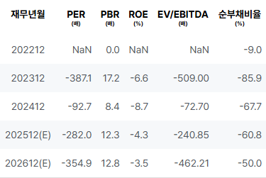 현재 기업의 PBR 및 PER 지표를 살펴보면, PBR은 변동성이 있으며, 여러 해에 걸쳐 부정적인 수치를 기록하고 있습니다. PER 또한 -로 표시된 해가 많아 기업의 수익성이 여전히 부정적인 상황임을 감안할 때, 현재 주가 수준은 과대평가되어 있다고 판단됩니다. 기업의 재무 건전성을 고려할 때, PBR이 절대적인 기준으로 작용하기 어려운 상황입니다. |