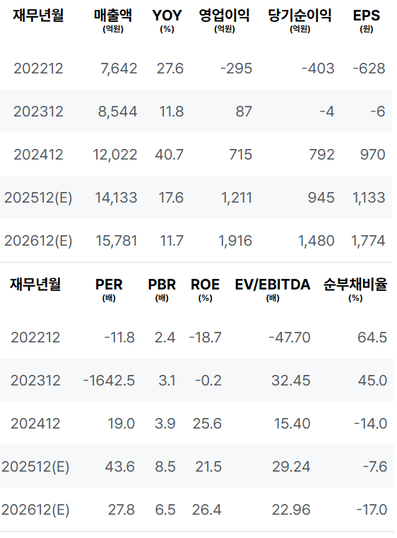 2025년의 재무적 기본 요소들은 강한 성장 추세를 나타내고 있습니다. 매출 및 영업이익의 배증은 기업의 재무 건전성을 개선하는 중요한 요인이라 할 수 있습니다. ROE도 긍정적인 수치를 유지하면서 개선되고 있으며, 이는 기업의 장기적인 성장 가능성을 나타냅니다. |