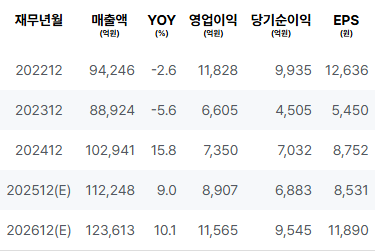 2026년 예측치에 따르면 매출이 다시 증가할 것으로 보이며, 영업이익과 순이익 또한 상승할 것으로 예상됩니다. 그러므로 장기적인 관점에서는 긍정적인 신호가 감지됩니다. |