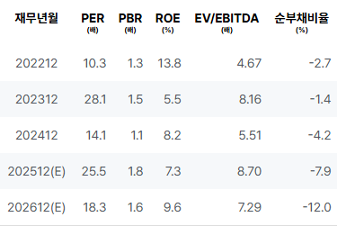 2025년에는 매출이 증가하는 반면, 영업이익과 순이익이 이전 해보다 개선되지 않는 모습을 보입니다. PER와 PBR 수치도 불황을 반영하는 경향이 되어, 투자 심리가 소극적으로 변화한 것을 시사합니다. 전체적으로 펀더멘탈 지표의 변동성이 큰 상황에서 안정적이지 못한 해석이 가능합니다. |