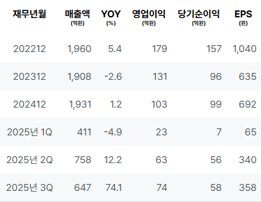 2022년에 매출은 증가하였으나 2023년에는 소폭 감소하였습니다. 2024년에는 약간의 회복세를 보이며 매출이 증가하였습니다. 2025년 nQ에서 첫 분기 대비 상승세가 나타나며 매출 증가가 확인되었습니다. |