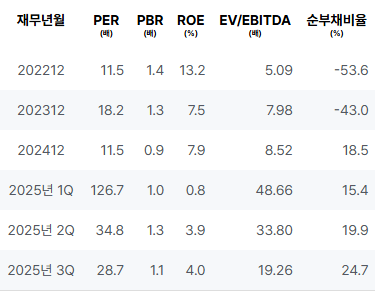 2025년의 가치평가 지표는 안정적인 상태로 평가됩니다. PER은 다소 상승하였으나 여전히 유의미한 범위 내에 있습니다. PBR은 비교적 낮은 수준을 유지하고 있으며, ROE는 낮은 수치를 기록하지만 회복 가능성이 있습니다. |