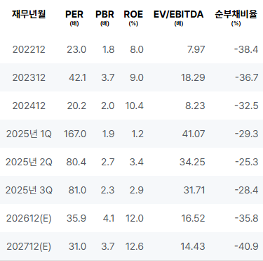 2025년: PER은 높은 수준을 유지하고 있으나, PBR 또한 증가세를 나타내고 있어 향후 자산 성장 가능성을 보여줍니다. ROE는 증가하며, 안정적인 수익성 지표를 나타내고 있습니다. |