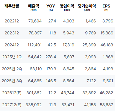 2022년: 매출은 감소세를 보였으나, 영업이익과 순이익은 안정적인 성장을 유지하였습니다. 2023년: 매출과 영업이익 모두 증가하며 특히 순이익에서 큰 폭의 개선이 나타났습니다. 2024년: 매출과 영업이익이 크게 상승하였으며, 순이익은 증가세가 두드러졌습니다. 2025년 1Q: 매출이 다소 감소하였으나 영업이익은 유의미한 증가를 보였고, 순이익 또한 견조한 흐름을 유지하였습니다. 2025년 2Q: 매출 증가와 함께 영업이익 및 순이익이 상승세를 지속하였습니다. 2025년 3Q: 매출이 보합세를 보이며 영업이익에서는 증가가 있었고, 순이익은 양호한 수준에 도달했습니다. |
