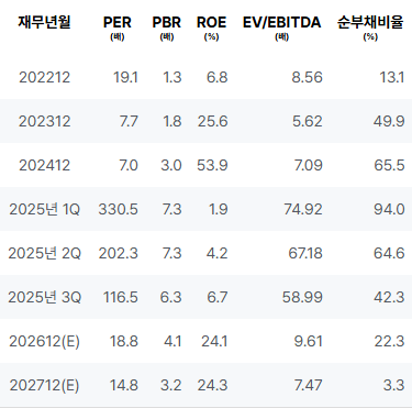 2025년: PER은 다소 높은 수준이지만, ROE는 긍정적인 개선세를 보이고 있으며, PBR은 상승세에 접어들며 다소 낮은 수준을 유지하고 있습니다. 전반적으로 주가의 변동성과 비교할 때, 주식의 평가가치가 상대적으로 안정적으로 유지되고 있는 것으로 나타났습니다. |