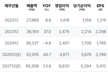 2027년에는 매출과 영업이익이 더욱 커질 것으로 보이며, 순이익 또한 건강한 성장세를 보일 것으로 예상됩니다. 이러한 추세는 향후 지속적인 기업의 실적 향상으로 이어질 가능성이 있습니다. |