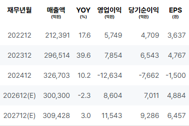 전반적으로 2022년과 2023년의 성과는 긍정적이며, 2024년에는 영업이익과 순이익에서 부정적인 결과가 나타났으나, 2026년 및 2027년의 전망은 매출과 이익 모두 성장할 것으로 보여 향후 긍정적인 신호로 평가됩니다. 다만, 시장 상황에 따라 변동성이 클 수 있음을 감안하여 신중한 접근이 필요합니다. |