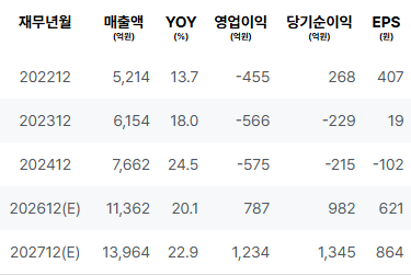 2027년(E): 매출과 영업이익, 순이익 모두 추가적으로 성장할 것으로 기대되며, EPS 또한 긍정적인 개선이 이루어질 것으로 보입니다. 전반적으로 2027년은 재무 상태가 더욱 호전될 것으로 예상됩니다. |