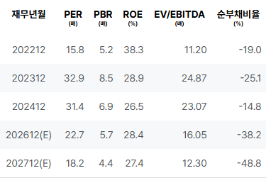 2026년은 매출, 영업이익, 순이익 모두 높은 성장세를 기록할 것으로 보입니다. PER은 낮아지면서 긍정적인 평가를 받을 것으로 예상됩니다. PBR은 안정세를 유지할 것으로 보입니다. |