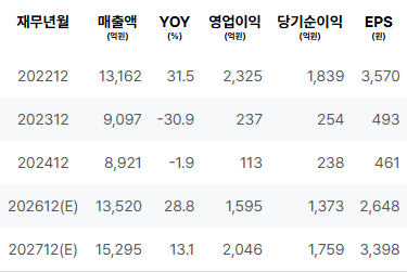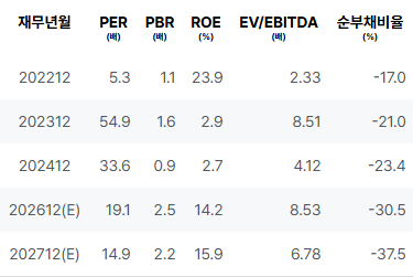 2026년(E): 매출이 회복세를 보이며 영업이익과 순이익 모두 증가할 것으로 예상됩니다. PER과 PBR도 안정세를 찾을 것으로 보입니다. ROE도 개선될 전망입니다. 2027년(E): 매출과 영업이익, 순이익이 모두 성장할 것으로 예측됩니다. PER과 PBR은 안정적이며 ROE 또한 개선될 것으로 보입니다. |
