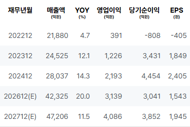 2026년(E): 매출이 큰 폭으로 성장할 것으로 예상되며, 영업이익과 순이익의 감소 추세가 이어질 것으로 보입니다. 특히, PER이 급격히 증가하여 밸류에이션 부담이 커질 것으로 예상됩니다. |