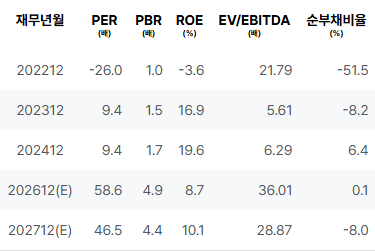 2026년: PER이 높은 수준으로 올라가며, PBR 또한 증가할 것으로 보입니다. ROE는 감소세를 보이나 긍정적인 회복세를 나타낼 것으로 예상됩니다. 전반적으로 안정적인 재무 구조를 유지할 가능성이 있습니다. |