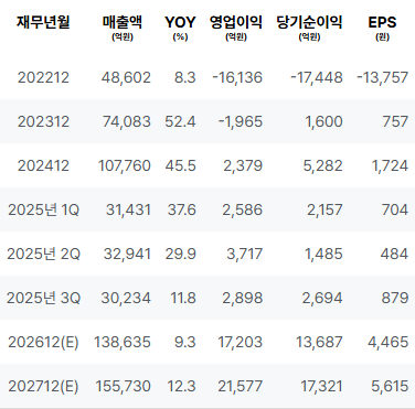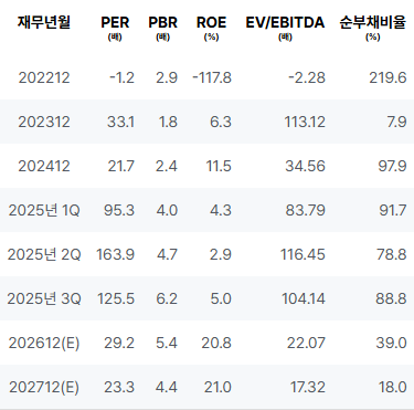 2026년(E): 매출이 매우 긍정적인 성장을 나타내며, 영업이익이 상당히 개선된 것으로 추정됩니다. 순이익 또한 높은 증가세를 보일 것입니다. 현재 지표는 호전된 재무 상태를 반영하며, 향후 성장 가능성이 기대됩니다. |