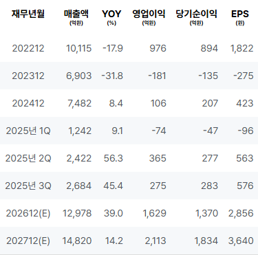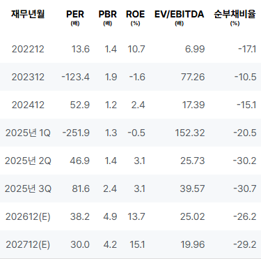 2022년: 매출 성장이 매우 가시적이며, 안정적인 영업이익과 순이익을 기록하였습니다. 2023년: 매출이 감소하였으며, 영업이익과 순이익 모두 손실을 나타내 불확실성을 더욱 증가시켰습니다. 2024년: 매출이 증가하였으나 영업이익은 미미하고 순이익은 소폭 증가하여 개선의 조짐이 보입니다. 2025년 1Q: 매출이 감소하여 영업이익과 순이익은 부진한 상황이 지속되었습니다. 2025년 2Q: 매출이 증가하여 영업이익과 순이익은 개선되었으며, 긍정적인 변화가 감지되었습니다. 2025년 3Q: 매출이 지속적으로 증가하였고, 영업이익과 순이익도 안정적으로 개선되었습니다. |