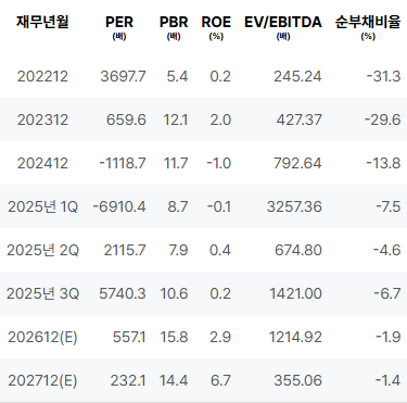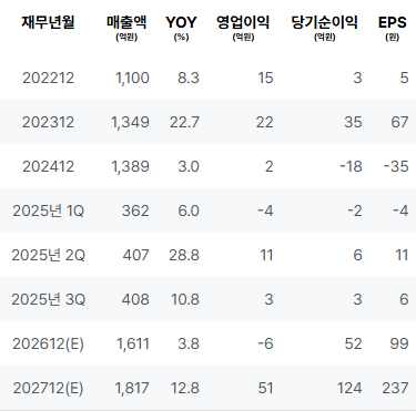 2022년 매출은 전년 대비 성장을 보였고, 영업이익과 순이익 역시 긍정적인 추세를 기록했습니다. 2023년에는 매출이 증가하였으며, 순이익 또한 상승세를 이어가는 가운데, ROE 또한 개선되었습니다. 그러나 2024년에는 영업이익이 크게 감소하고 순이익이 적자로 전환되며 우려를 나타내었습니다. 2025년 1분기부터 3분기까지는 매출이 변동성을 보였으며, 다소 회복세를 나타내긴 했으나 지속적인 적자가 관찰되었습니다. |