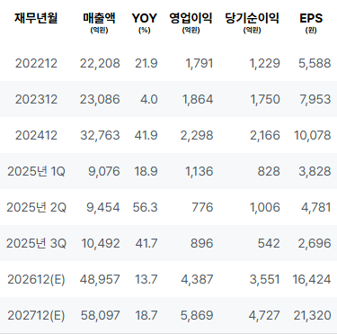 2022년의 매출은 증가세를 보이며, 영업이익과 순이익 또한 양호한 성과를 기록하였습니다. 2023년에는 매출과 영업이익, 순이익 모두 상승세를 유지하고 있으며, EPS와 ROE 또한 개선되고 있습니다. 2025년 1Q부터 3Q까지는 변동성이 있나, 매출은 지속적으로 증가하고 있는 추세입니다. |