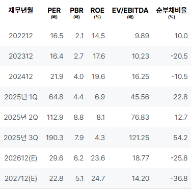 2026년에는 매출이 상당히 증가할 것으로 예상되며, 영업이익 및 순이익 또한 호전될 것으로 보입니다. EPS는 이전보다 두드러진 성장세를 나타낼 것으로 예상됩니다. 금번 연도의 PER과 PBR이 높지만, ROE 역시 상승할 것으로 예상됩니다. |