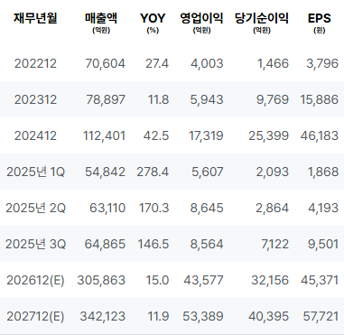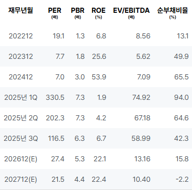 2023년의 영업이익과 순이익이 대폭 상승하였으며, ROE 또한 크게 개선되었습니다. 2025년 1분기 매출 데이터는 이전 연도와 비교하여 증가하였고 영업이익도 견고한 모습을 보입니다. 2025년 2분기에도 매출과 영업이익이 상승세를 지속하였습니다. 2025년 3분기에는 순이익이 확인되었으며, 전반적으로 강력한 성장을 이어가고 있는 모습입니다. |