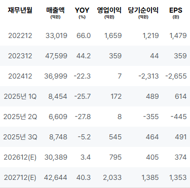 2022년부터 2024년까지의 실적은 매우 변화무쌍한 양상을 보였으며, 2023년과 2024년에는 실적 저하가 관찰되었습니다. 2025년의 실적 개선 기대와 2026년의 긍정적 전망에도 불구하고, 전체적으로 다소 불확실한 요소들이 존재합니다. |
