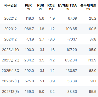 2022년 매출 증가가 있었으나, 2023년과 2024년에는 실적 저하가 관찰되었습니다. 2025년의 매출 증가와 긍정적인 실적 개선 기대가 있으나, 여전히 불확실한 요소들이 존재합니다. 2026년에는 매출과 영업이익의 회복이 예상되며, 순이익도 긍정적인 변화를 나타낼 것으로 전망됩니다. 2027년에는 매출, 영업이익, 순이익 모두 큰 폭으로 개선될 것으로 기대됩니다. 그러나 현재의 높은 PER과 PBR은 향후 수익성 개선에 대한 신중한 접근을 필요로 하며, ROE의 낮은 상태는 이를 더욱 방증합니다. |