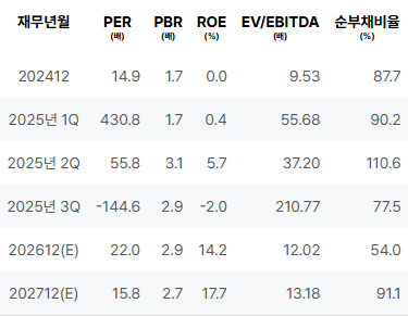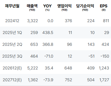 2024년에는 매출이 증가하고 영업이익, 순이익이 양호한 실적을 기록하였습니다. 2025년 1분기에는 매출이 감소하였고 영업이익이 낮아졌으나, 2025년 2분기에는 매출과 영업이익이 증가하였습니다. 2025년 3분기에는 매출이 감소하며 순이익이 적자를 기록하였습니다. |
