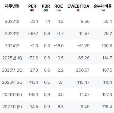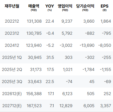 2022년 매출 증가세가 있었으나, 2023년 전환점에서 순이익이 급감하였습니다. 2024년에는 손실이 확대되며 부정적인 추세가 지속되었습니다. 2025년 1분기와 2분기에도 영업이익과 순이익이 감소하였고, 3분기에는 겨우 소폭 회복세를 보였습니다. |