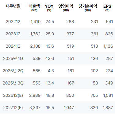 2022년 매출은 증가하였고, 영업이익, 순이익 또한 증가세를 보였습니다. 2023년은 매출, 영업이익, 순이익이 모두 전년 대비 상승하였습니다. 2024년에도 계속해서 긍정적인 성장세가 연속되는 추세입니다. 2025년 1분기에서 3분기까지의 데이터는 매출과 영업이익이 다소 변동성을 보였으나, 여전히 성장을 이어가고 있습니다. |