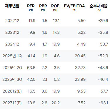 2026년 예상 매출은 강한 성장세를 점치고 있으며, 영업이익과 순이익 또한 증가할 것으로 예상됩니다. PER 및 PBR은 이전 연도 대비 상승하였으나, ROE는 안정세를 유지할 것으로 판단됩니다. |