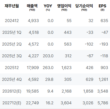 2024년 매출은 안정적으로 증가하였으나, 영업이익과 순이익이 비교적 저조한 실적을 보였습니다. 2025년 1분기부터 3분기까지 매출이 다소 감소하였고, 영업이익과 순이익 또한 적자를 기록하며 부담스러운 상황이었습니다. 2025년 총연간 기준으로는 매출이 회복세를 보이며, 영업이익과 순이익이 긍정적인 변화를 보였습니다. |