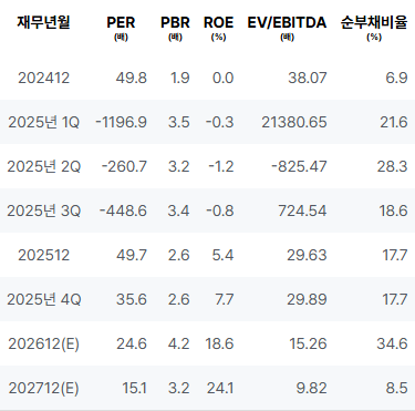 2024년부터 2026년까지 매출 성장세가 두드러지고 있으며, 영업이익과 순이익의 개선이 기대됩니다. 2024년에는 매출이 안정적으로 증가했으나 영업이익과 순이익은 저조했습니다. 2025년 동안에는 약간의 매출 감소와 적자를 기록했으나 연말에는 매출 회복세를 보이며 긍정적인 변화를 나타냈습니다. 2026년에는 매출, 영업이익, 순이익 모두 개선될 것으로 보이며, 2027년에는 더욱 증가할 것이 예상됩니다. 2026년의 PER 감소와 PBR 증가로 인해 가치를 갖춘 상황으로 평가될 수 있으며, ROE 역시 증가세를 보입니다. |