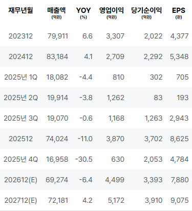 2026년(E) 매출은 다소 증가할 것으로 예상되며, 영업이익과 순이익 또한 개선될 것으로 보입니다. 이에 따라, 전체적인 수익성 지표가 향상될 것으로 기대됩니다. 이와 같은 전망은 긍정적입니다. |