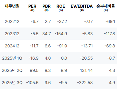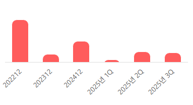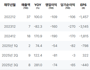 2022년 대비 2023년은 매출이 현저히 감소하였고, 영업이익 및 순이익 역시 전년 대비 악화되었습니다. 2024년에는 매출이 증가하였으나, 영업이익과 순이익은 여전히 적자를 기록하였습니다. 2025년 1분기에서는 매출이 다소 회복되었지만, 영업이익과 순이익은 여전히 적자 상태를 유지하고 있습니다. 2025년 2분기에는 매출이 크게 증가하였으나, 영업이익은 다시 적자의 모습을 보입니다. 2025년 3분기 역시 매출이 소폭 감소하면서 영업이익 및 순이익이 악화되었습니다. |