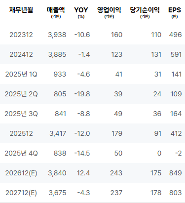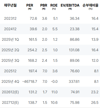 2026년(E): 매출이 소폭 증가할 것으로 보이며, 영업이익과 순이익이 긍정적인 흐름을 예상합니다. ROE는 개선될 것으로 판단됩니다. PER과 PBR도 긍정적인 조정을 받을 것으로 예상됩니다. |